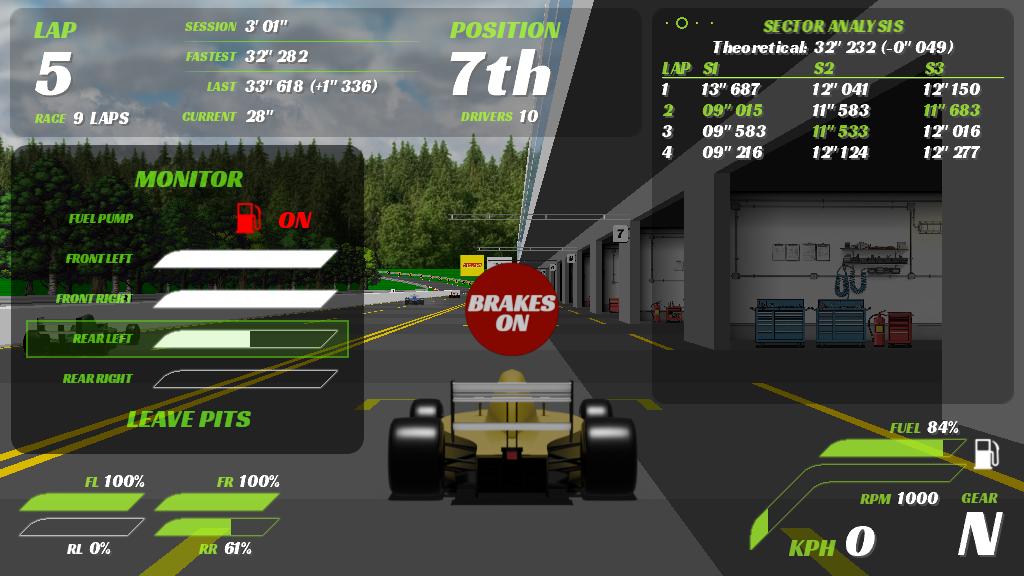 - Pit stop management including tyres change and fuel refill